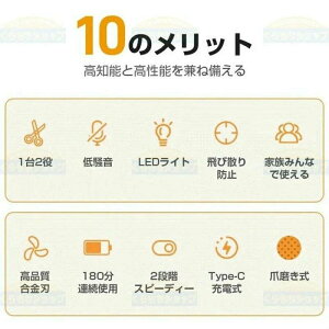 この商品について【2種類の運転速度】 電動爪削り器は回転スピードを2つ持っています、電源ボタンを長押しすることで電源ON、そのまま短くもう一度ボタンを押すことでモードが変わります。低速は子供に適し、高速は高齢者...