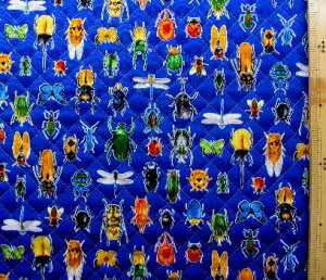 ブロックでつくったようなドット絵の昆虫がいっぱいのオックス生地をキルティングした生地です。 布巾…約106cm巾 素材…表 綿100%、裏 綿100%、中綿 ポリエステル100% ☆価格は、50cmの価格を
