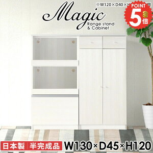 大型電子レンジも対応!食器棚も兼ねたレンジボードmagic レンジ台×キャビネット W130×D45×H120 木目。サイズサイズ:約幅1300 奥行き450 高さ1200 mm。材質[天板・スライド棚]メラミン樹脂化粧合板[前板]ブ...