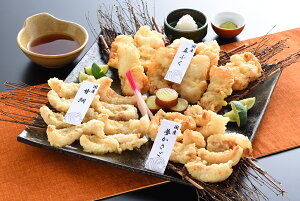 国産の真ふく・甘鯛・夢かさごを天ぷらにしました。電子レンジで温めるだけの簡単調理で天ぷらをお楽しみいただけます。電子レンジで温めた後、ひと手間かけてオーブントースターで加熱すると、外はサクッ中はふんわりとした天ぷらに