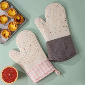【耐熱ミトン】手袋生地が厚く、丈が長いので、熱いものを持つ時も手や腕を熱から守ってくれます、熱々のお皿と食器を気軽に持って食卓へ運びます。高温によるやけどなどを心配しません。 【滑り止め機能】表面に格子模様がデザインされており、シンプ...