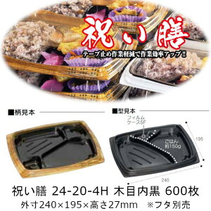 商品名 祝い膳 24-20-4H 木目内黒 商品コード 0728330 外寸・深さ(mm) 240×195×27 ケース入数 600枚 袋入数 50枚 素材 PPF(フィラー入りポリプロピレン) メーカー 福助工業株式会社 販売者 株...