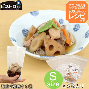 食材と調味料を入れるだけ、湯煎で調理する袋Sサイズ(5枚入り) 湯煎ボイルOK、冷凍・冷蔵OK、洗って繰り返し使用OK、電子レンジOK(長時間の使用は不可)の食品調理パック。 仕込みは食材を袋にいれるだけ、少量の調味料でしっかり味がつき、