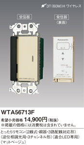 【仕様】●メーカー:パナソニック ●型番:WTA56713H ●商品名:とったらリモコン ●アドバンスシリーズ ●2線式・親器・3路配線対応形 ●逆位相調光用・3チャンネル形 ●適合LED専用3.2A...