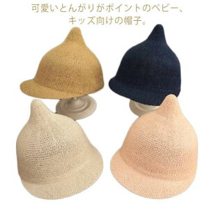 可愛いとんがりがポイントのベビー、キッズ向けの帽子。通気性の良い素材で暑い季節でも蒸れにくい。あご紐付きで飛ばされにくく安心です。ころんとしたフォルムと優しいカラーがキュート!コーディネートのアクセントに。豊富なカラ