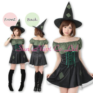 ガーリーな魔女コスでパーティーのヒロインに! とんがり帽子で魔女度アップのキュートな魔女衣装! セクシーなオフショルダーワンピースで誘惑の魔法使いに! スモーキーカラーの落ち着いたダークグリーンが印象的。 ハイクオリティー