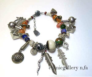 シルバーのフェザーと天然石をメインに アンティークカーネリアンやシェブロン玉、 様々な模様のシルバービーズが連なった 重厚感のあるブレスレットです。 ウジャトの目や蛇が古代神話を連想し、 お守りにもなりそうな1点ものです。 <