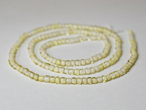 外側が無色透明で芯が白い、中小粒サイズのホワイトハートビーズ一連です。ホワイトハートのこの色のホワイトハーツは珍しいです。全体の約3分の1程度の粒が淡く黄色みがかっています。革紐を使ったインディアンジュエリーやアクセサ