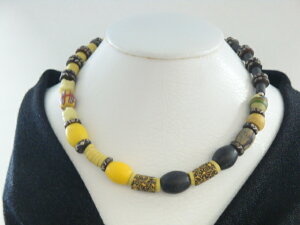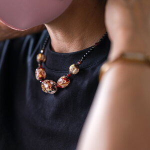 コロンとしたかわいらしいフォルムのとんぼ玉をアレンジしたネックレス。 ひとつひとつ丁寧に絵付けした艶のあるとんぼ玉をシックなブラックとゴールドビーズで大人っぽい印象に引き締めました。<b...