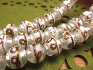 ◆ホワイト系です◆スマホや携帯音楽プレーヤーにアクセント。ハンドワークでガラス玉に金箔をとじこめた小さなストラップ。 ◆金色の玉×真珠母貝。エレガントでていねいな作りの一点もの。 ◆やさしいカラーリングが、携帯にもよく映