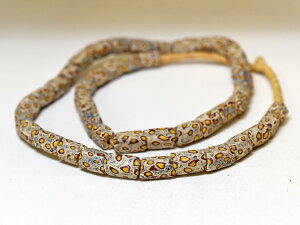 主にアフリカ向けの交易品として作られた、ミルフィオリ(千の華)と呼ばれるヴェネチア産のアンティークミックスガラスビーズ一連です。四角管型の形状で、本来はブルーだったものが全て白っぽくなっています。恐らく、長期間地中に