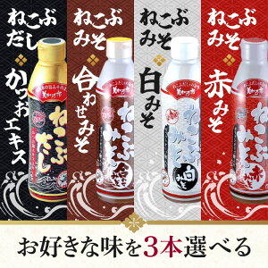 【ねこぶみそ等 選べる3本セット(ねこぶだし・合わせ・赤みそ・白みそ)】 ● かつお節エキスをブレンドした料理の味を引き立てる万能調味料で、和食をはじめさまざまな料理に使用できます ...