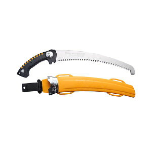 【商品特長】【用途】生木の切断。【機能・特徴】大型のカーブソーで、挽くだけで刃が食い込み、太い枝も楽に剪定できます。鞘に3Dローラーを装備しているので、鋸の出し入れが大変スムーズです。3Dローラーによるロック機能で、鋸刃が