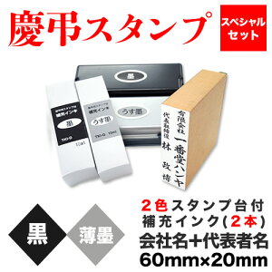 商品詳細 セット内容 慶弔スタンプ(会社名+代表者名)1個 墨・薄墨の2色スタンプ台1個 補充インク 各1本 捺印サイズ たて約60mm よこ約20mm 文字数 会社名部分 ■漢字は最大10文字 ■カタカナは...