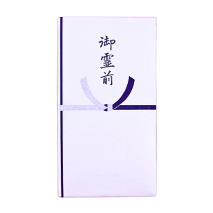 49日未満で、主にお通夜やお葬式の時に使用する不祝儀袋です。水引は結び切りです。 金封は多当式で、お金を入れる封筒付きです。金封は版画用紙に紫と銀で水引がプリントされています。中封筒は氏名、住所、金額、郵便番号、電話番号