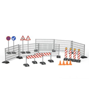セット内容:工事標識4種×各1、コーン×2、バリケード×2、工事灯×4、フェンス×6、土台×20。生産国:ドイツ。推奨年齢:3歳以上。