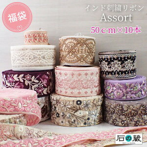 石の蔵の事務所移転を記念して、大人気アソートセットが特別価格です! ハンドメイド作家さんに人気のインド刺繍リボンを、1mずつ20種類 詰め合わせました。 様々な幅や素材、テイストのリボンを50cmずつ10種類をパックしています。 50cmの