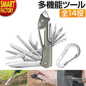 【材質】 本体:ステンレス カラビナ:アルミニウム 【仕様】 ナイフ、鋸刃ナイフ、はさみ、-ドライバー、+ドライバー、穴開け、爪ヤスリ、爪そうじ、ひも通し、針はずし、うろこ取り...