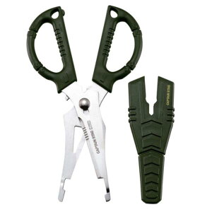 “ナイフ・はさみ・のこぎり・針外し・うろこ取り・缶切り・栓抜き・プラスドライバー・ピック・爪磨き・爪垢取り・リーマー・コルク栓抜き・ホルダー”を備えた14inマルチプライヤー。 ギアの調整やサバイバルに役立つ多様なツールを