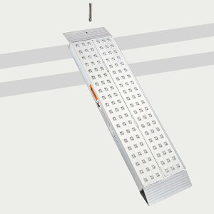 折りたたみ式アルミブリッジ。●製品サイズ:長さ1,820×幅295×厚み110mm。●収納時サイズ:長さ925×幅295×厚み180mm。●製品重量:6.6kg。●耐荷重:1本につき200kgまで。●材質:アルミ。