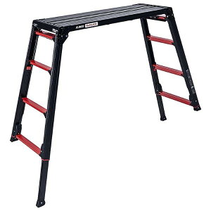 本体天板寸法400mm×1055mm 天板高0.95mmー1.39mm調整可能 伸縮脚の調整を立ったままできるという進化と、止め金具の自動ロック化による安心感を併せもった新型足場台がブラック&レッドのコントラストで登場