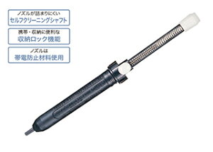 ●静電対策品 ●静電気防止ノズル採用。 ●セルフクリーニングシャフトで快適作業。 ●収納ロック機能付。 ●全長:275mm ●収納時:205mm ●重量:65g ●本体径:Φ19mm ●交換部品 交換ノ