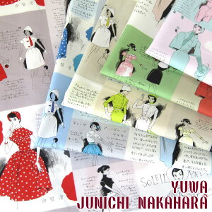 中原淳一氏が手がけた木版画「娘十二ヶ月」を使用したプリント生地。 モダンで叙情的な少女画が並んだデザインです。 背景には麻の葉文様が施され、昭和レトロな雰囲気たっぷりの愛らしいアイテムです。 素材は綿100%のシャーティング