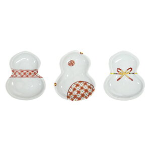 吉祥紋変わり型小皿の3枚セット。ひょうたん型の生地に、きゅっと水引を結んだ赤絵、赤絵丸紋、赤絵帯七宝、それぞれの絵付けも愛らしい仕上がりです。薬味入れや、漬け物、醤油皿、ま