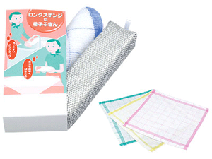 カラー 4色取り混ぜ(ピンク、イエロー、ブルー、グリーン) サイズ ふきん:350×350mm、スポンジ:38×38×160mm 材質 綿、ポリウレタン他 包装 透明袋:80×160×40mm