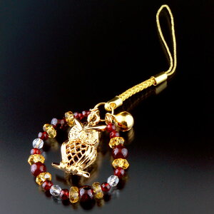 <材質>ふくろうパーツ:真鍮ガーネット:6mm 珠×4個、4mm 珠×10個白水晶:4mm 珠(カット)×3個黄水晶:6x3mm (カット)×8個鈴:8mm ×1個(鉄)付属品:専用巾着袋