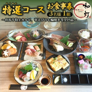 商品説明 名称 『特選コース』<3名1組>お食事券 〜但馬牛特上カルビ、車えびの七輪焼き等全19品〜 内容 ※ご利用には2日前迄にご予約が必要です。 ※ごはんものを「手打ち蕎麦」に変更の場合は、予約の際にお伝えください...