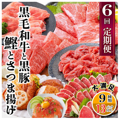 【定期便6回配送】鹿児島県産の黒毛和牛と黒豚。焼肉や、すき焼き・しゃぶしゃぶなどお肉の柔らかさ、脂の旨味をご堪能下さい。炭火で焼いた鰹タタキや、枕崎港で水揚げされたお魚を豊富に使ったさつま揚げ、タレに枕崎産かつお節のだしを使用した人気...
