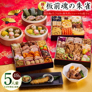 返礼品説明 名称 【ふるさと納税】おせち「板前魂の朱雀」和洋中華風 三段重 49品 5人前 特大 8.5寸 豚角煮&焼売4種&鮑&餃子2種&たこちまき 付き 先行予約 年内発送 内容量 仕様:三段重 8.5寸...