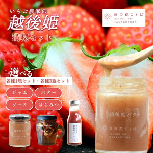 名称越後姫ジャム越後姫バター越後姫ソース苺はちみつ(取手付き)内容量越後姫ジャム120g入り 1瓶 越後姫バター115g入り 1瓶 越後姫ソース290g入り 1瓶 苺はちみつ(取手付き) 120g入り原材料越後姫ジャム:苺(新潟県上越...