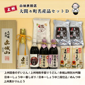 【110】大間々町名産品セットDみどり市大間々町で作られた名産品をセットにしました。 内容量 上州田舎のすいとん:1kg×1袋 上州黒かりんとう:300g×2袋 上州地粉手振りうどん:380g×2袋 ...
