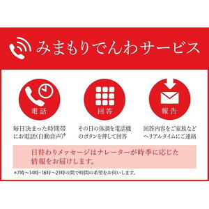 毎日指定された時間帯に自動音声電話をおかけし、利用者の体調確認結果をご家族様へお知らせするサービス(6か月間) 名称 みまもりでんわサービス(携帯電話コース) 注意事項 ※みまもりを受ける方が