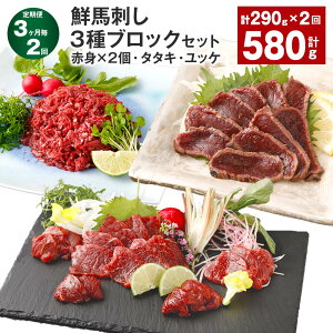 【ふるさと納税】【定期便】【3ヶ月毎2回】鮮馬刺し 3種ブロックセット(赤身×2個・タタキ・ユッケ) 計580g(290g×2回) 馬刺し 馬肉 お肉 肉 塩コショウ 塩胡椒 ニン...