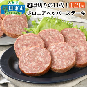 厳選した大分県産豚肉とブラックペッパーをはじめとした濃いめの香辛料で味付けしたボロニアペッバーソーセージを何と1.5センチの超厚切りにカットした、計11枚(1.21kg)のボリューミーなステーキセットです。噛むほどにあふれる良質な