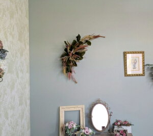 深いグリーンが綺麗なプリザーブドのレモンリーフをメインに ドライのユーカリや落ち着いたモーブピンク系の素材を合わせた秋色スワッグです。 壁掛け用のフックを数か所付けてあるので、飾る場所に合わせて向きを変えて飾り いろんな