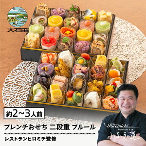 【大石田町産・山形県産食材を使用した本格フレンチおせち二段重】 恵比寿ガーデンプレイスのほど近くに構える「レストランヒロミチ」。両親ともに大石田町出身で幼少より山形に慣れ親しんだオーナーシェフ「小玉弘道」が監修した「フ