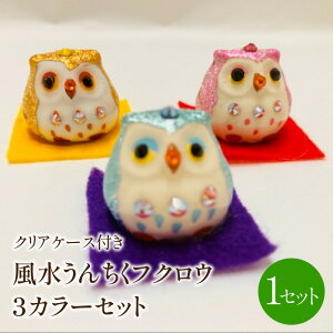 返礼品紹介 風水うんちくフクロウ3カラーセット(クリアケース付き)。 ※デコ製品の製作上、手芸用ボンドで厳重に貼り付けておりますが、本体の移動をされる場合の持ち方はデコ貼りが少ない両脇を持って移動させてください。 正面のお