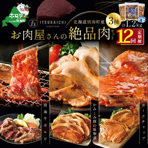 【ふるさと納税】【 肉 定期便 12ヶ月 毎月 定期 】別海牛 味付け カルビ 400g かみこみ 豚味噌漬け 400g ポークチャップ 400g 計1.2kg セット × 12ヵ...