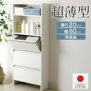 奥行約20cmのスリムなランドリーラックです。 狭い洗面所にも圧迫感無く設置できます。 毎日使う洗剤やタオル、着替えの収納に最適です。 ●場所を選ばない奥行約20cm 本体奥行は約20cm。 フラップ扉を開いても約36cm...