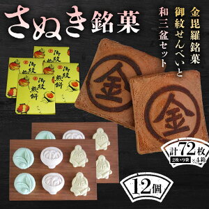内容量 ・御紋せんべい 18枚入(2枚×9袋) 4箱 ・和三盆12個 (うどん4個、オリーブ4個、こんぴーくん4個) 消費期限 御紋せんべい:90日 和三盆:180日 保存方法 常温 配送方法 常温 アレルギー...