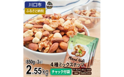 今話題の4種のミックスナッツを詰め込みました!鮮度を保つアルミチャック付き大袋タイプのミックスナッツです。内容量:約2.55kg(850g×3袋) (※製品の特性上、重量に±1