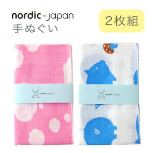 北欧テイストのプリント柄がかわいい手拭いセット。子供用にもおすすめ。 nordic+japan 手ぬぐい 2枚組 (ヒツジ・ピンク+ブタ・ブルー)