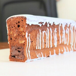 那須烏山市の人気観光スポット「龍門の滝」をイメージしたチョコケーキ。ガトーショコラとテリーヌショコラで龍門の滝の地層をクルミとオレンジで、地層の中の岩石をホワイトチョコレートで滝に流れる水を表現しました。 甘すぎないガ