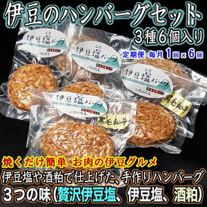 返礼品の詳細 商品名 【定期便 全6回】いなば肉店 伊豆のハンバーグ3種セット 毎月1回×6回 産地名 ・国産 原材料 ・贅沢伊豆塩バーグ:黒毛和牛(国産)、玉葱、パン粉、ソース、?油、卵、ケチャップ...