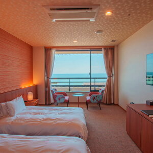 機能的にまとめられたスタイリッシュな洋室。 お部屋からは瀬戸内海を望むことができ、「日本の夕陽100選」に選ばれた絶景をお愉しみいただけます。客室内の檜風呂や源泉掛け流しの大浴場「洗心の湯」で、ゆっくりとこころと身体を整え