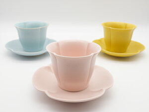 華奢な花型のカップ&ソーサーです。ピンク、ブルー、イエロー3色セット 【内容量】カップ&ソーサー φ8.3cmxH6.4cm 180cc 3客 【配送方法】通常 離島不可 【------------こんなわけで岐阜県の返礼品です!--...